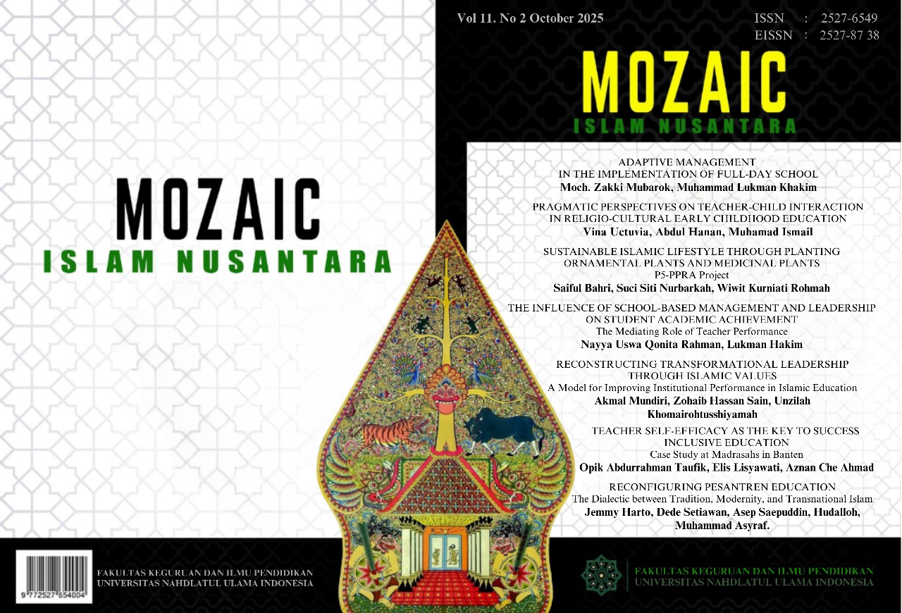 This study aims to reconstruct transformational leadership through the integration of Islamic values, offering a contextual model for enhancing the performance of Islamic educational institutions. The primary focus is to combine the core principles of transformational leadership with Islamic teachings to form a leadership framework that aligns with the spiritual, ethical, and cultural foundations of Islamic education. Using a qualitative approach and a case study design, research was conducted in several Islamic educational institutions across Indonesia. Data were collected through in-depth interviews, participant observation, and document analysis. The research findings indicate that Islamic values such as sincerity (ikhlas), trustworthiness (amanah), justice (‘adl), and deliberation (shura) reinforce the four key dimensions of transformational leadership: idealized influence, inspirational motivation, intellectual stimulation, and individualized consideration. These values do not replace transformational leadership elements but enrich and contextualize them, leading to improved institutional performance in managerial, academic, and spiritual aspects. The implications of this study underline the significance of internalizing Islamic values within leadership practices to build a productive, ethical, and spiritually grounded organizational culture. This integrated model can serve as a practical and theoretical reference for developing effective, authentic, and sustainable leadership in Islamic educational settings.