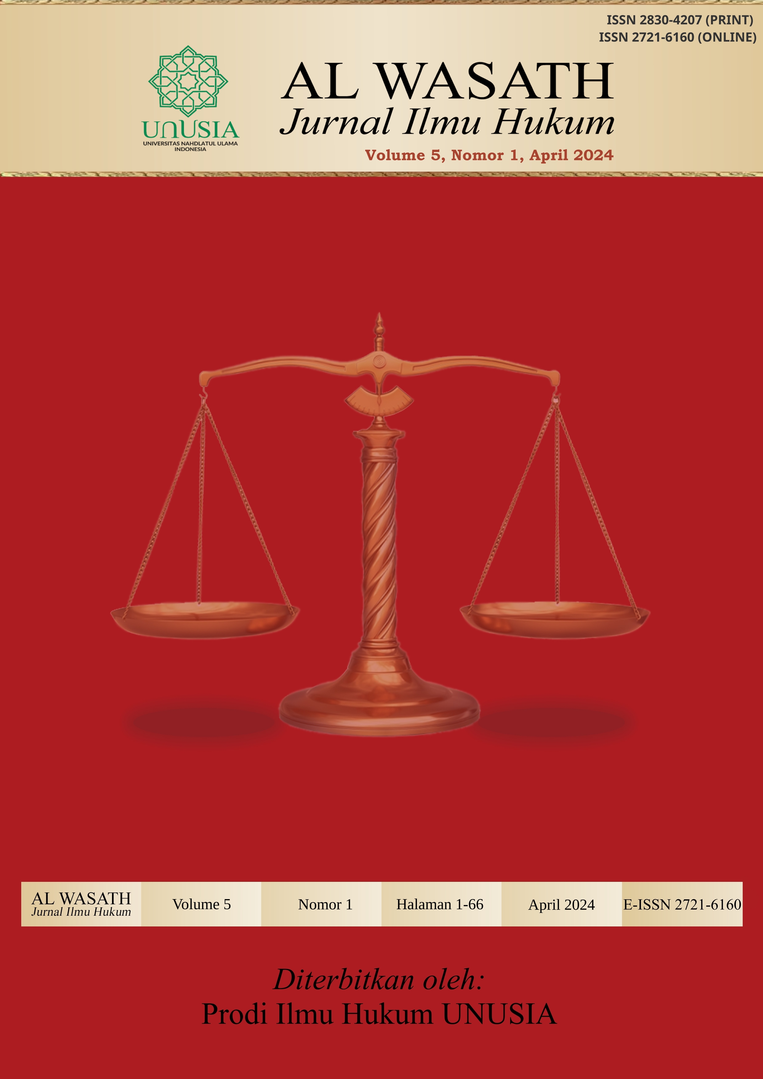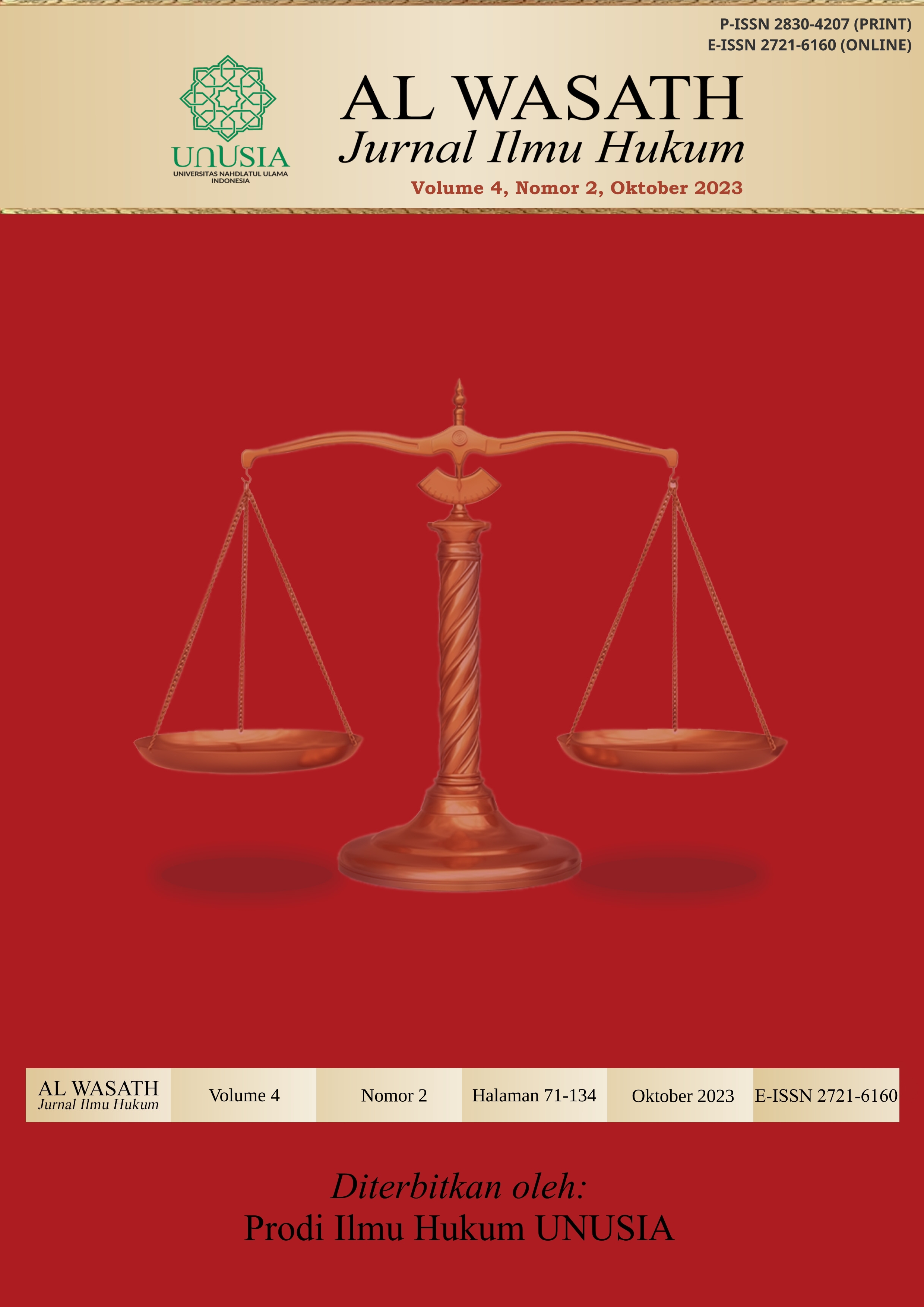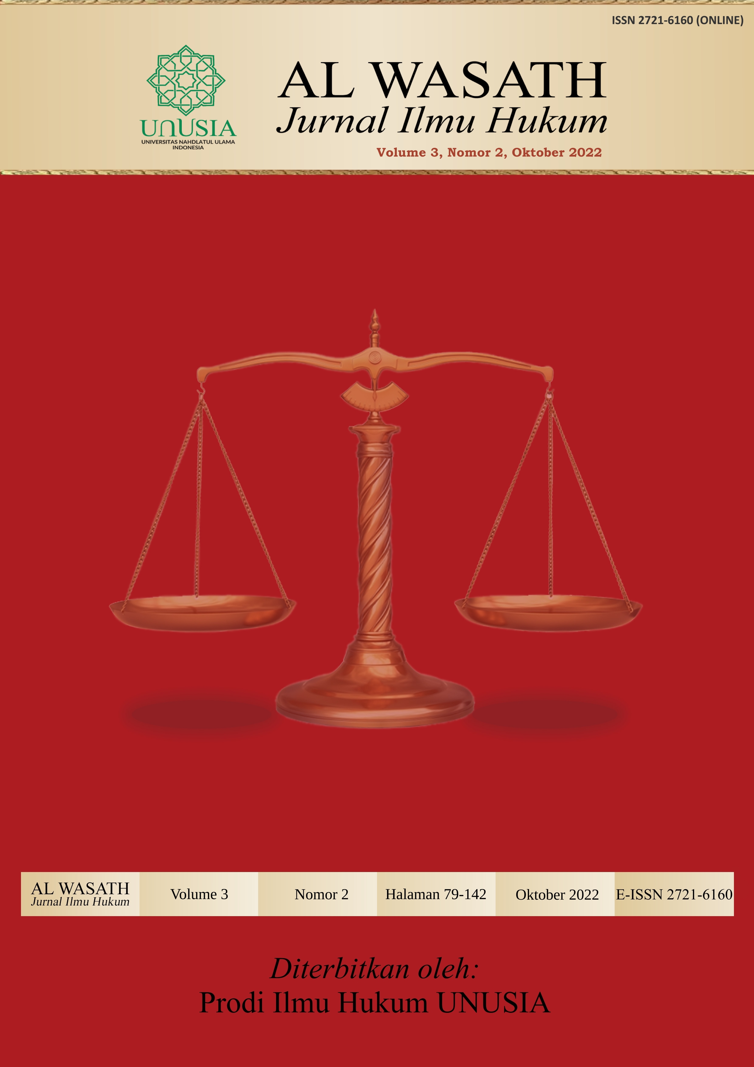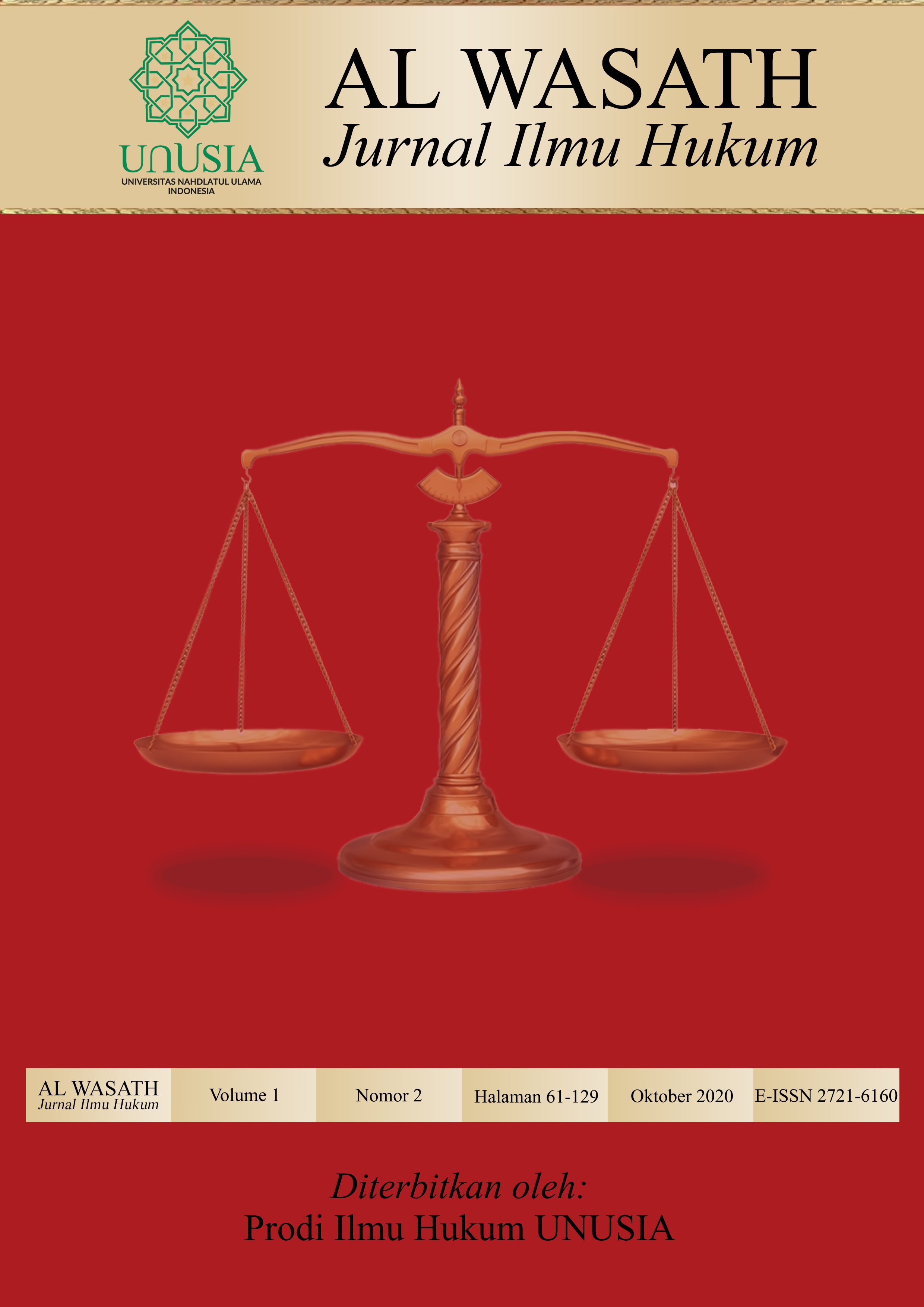 Vol. 1 No. 2 (2020)AL WASATH Jurnal Ilmu Hukum is an academic law journal published by the Faculty of Law, Universitas Nahdlatul Ulama Indonesia (UNUSIA). This Journal is opened for academics or professionals and focussed on various legal disciplines such as but not limited to constitutional law, labor law, private law, philosophy of law, international law, and Islamic law.